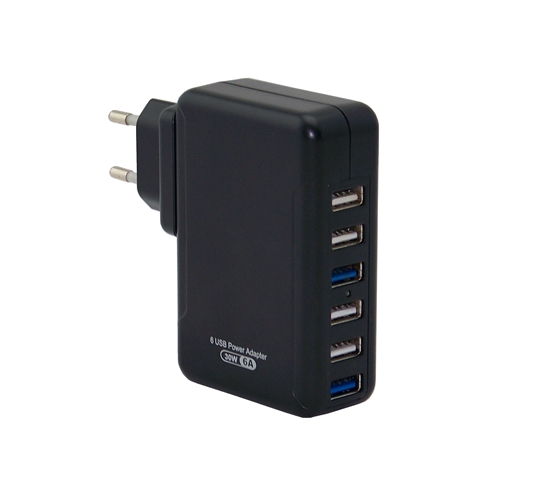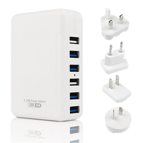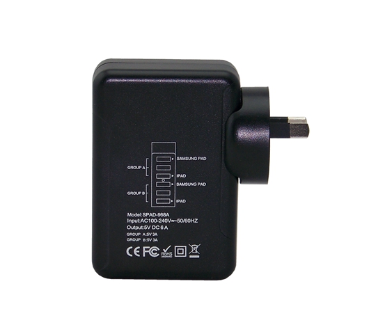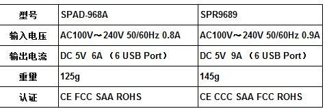 品牌:OEM 型号:SPAD968A, SPR9689 用途:各种手机类/ IPAD/ 移动电源/ GPS/数码音箱等各种5V输入类设备或支持快充的数码设备 产品名称:6口USB快速充电器 优点:1.每个USB能输出2.4A(MAX)的充电电流,内置智能识别芯片,能自动识别充电设备,达到与原装充电器一样的充电电流 2.每个USB口都有内置限流芯片,超过2.4A自动保护。 3.过电流保护,过功率保护,超温保护功能,并能耐不低于3000V的电压冲击,确保充电安全可靠 保修期:1年 认证:CE FCC ROHS