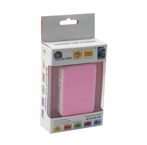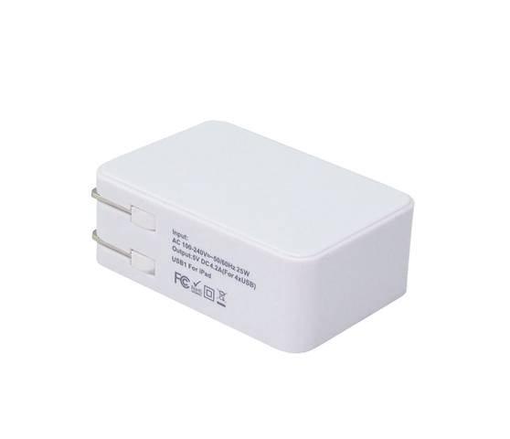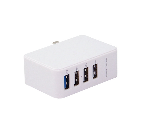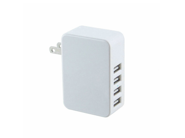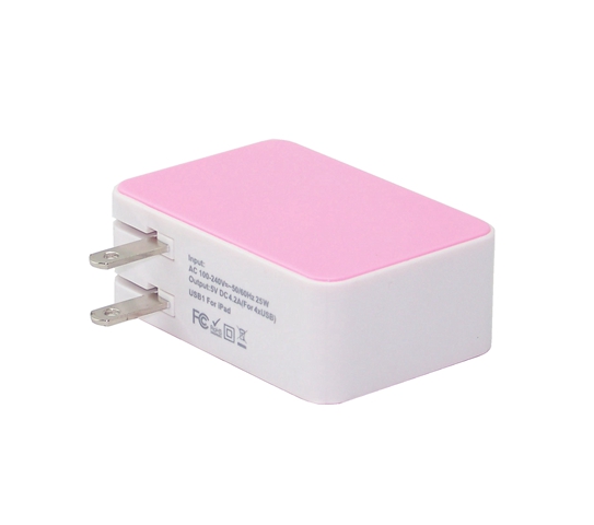 品牌:OEM 型号:SPAD836A 用途:各种手机类/ IPAD/ 移动电源/ GPS/数码音箱等各种5V输入类设备或支持快充的数码设备 产品名称:4口USB快速充电器 优点: 1.每个USB能输出2.4A(MAX)的充电电流,内置智能识别芯片,能自动识别充电设备,达到与原装充电器一样的充电效果 2.有过电流保护,过功率保护,超温保护功能,并能耐不低于3000V的电压冲击,确保充电安全可靠 保修期:1年 认证: FCC CCC ROHS
